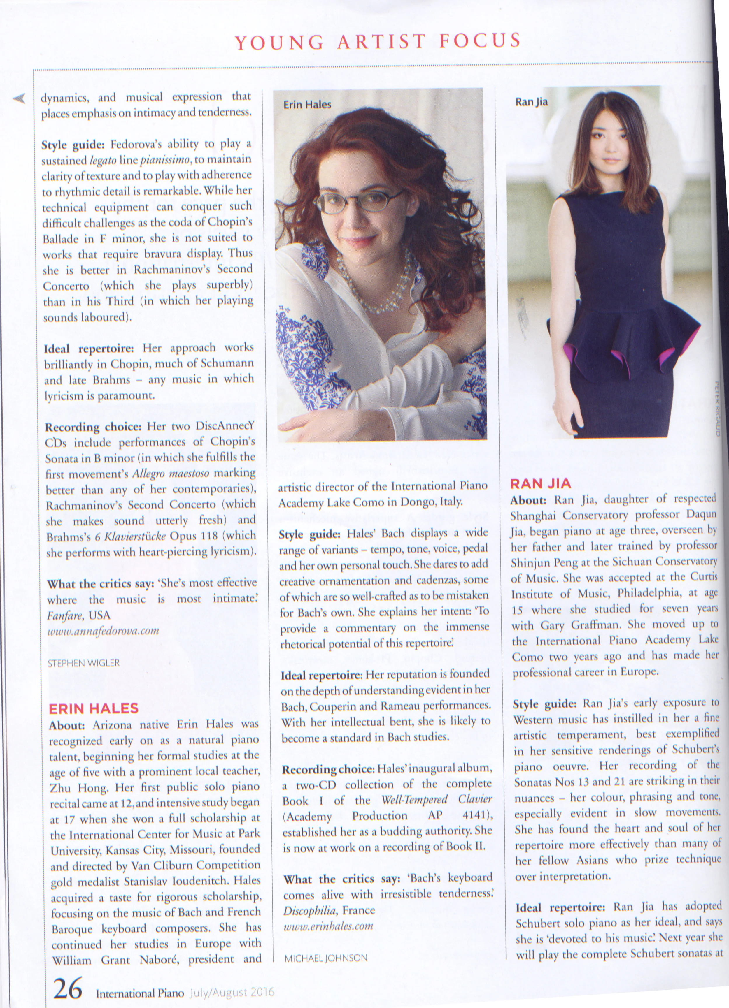 "The late Ms. Tureck (the “First Lady of Bach”), and perhaps the few other pianists who have had the confidence to improvise around Bach, would approve. She called embellishment of Bach’s piano music “a life study in itself”. No doubt true but Ms. Hales seems to have achieved, through her musicological interests, a depth of understanding remarkably early in her career."